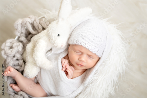 © Any Grant, Obraz premium A cute newborn baby in a bunny hat with ears is sleeping sweetly in a basket