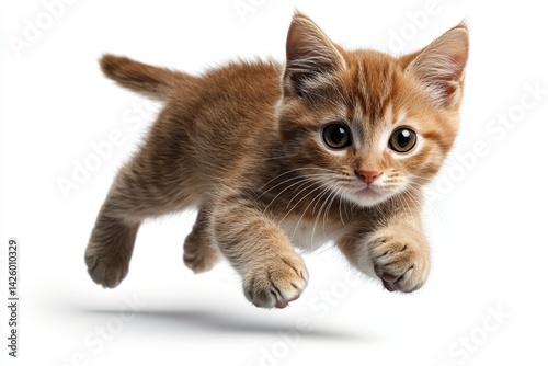 © Thanyarat, Obraz premium A cute, orange kitten jumping up against a white background, high-definition photography, high resolution