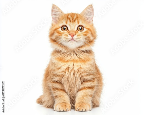 © UnderTheSun, Fototapeta premium A cute orange kitten sitting upright with a fluffy coat and big, expressive eyes against a white background.