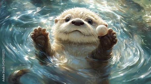 Fototapeta premium A cute otter floats on its back in clear water, holding a seashell in its paws. Its soft, damp fur and sparkling eyes exude joy.