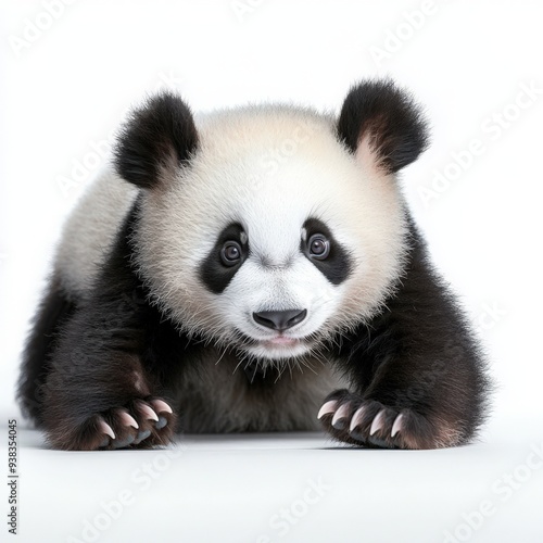 © missisya, Naklejka premium A cute panda cub sitting innocently, showcasing its black and white fur with distinct facial markings. Perfect for wildlife enthusiasts.