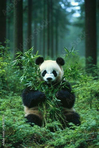 © Manatchaya, Fototapeta premium A cute panda sits in a lush forest, holding bamboo, surrounded by greenery, showcasing its playful nature and natural habitat.
