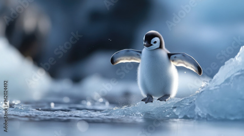 © Chonticha, Fototapeta premium A cute penguin chick flapping its tiny wings as it tries to balance on a slippery ice patch