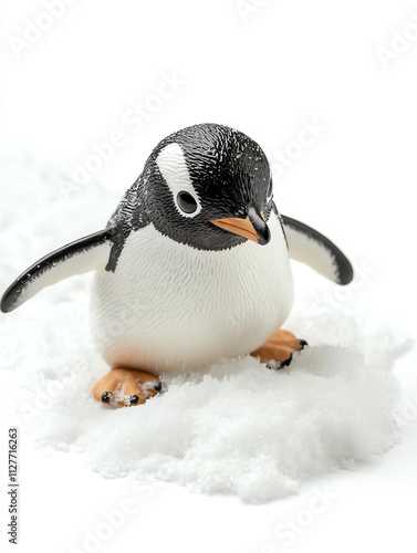 Fototapeta premium A cute penguin figurine stands on a snowy surface, showcasing unique textures...