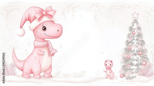 Naklejka premium A cute pink dinosaur in a Santa hat stands beside a small creature near a decorated Christmas tree, creating a whimsical holiday scene.