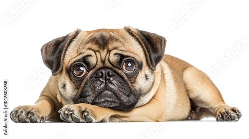 © BerkahStock, Obraz premium A cute pug dog lying down with a sad expression on a white background.