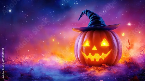 Naklejka premium A cute pumpkin with a witch hat against a pastel purple and orange sky, twinkling stars adding to the Halloween fun.