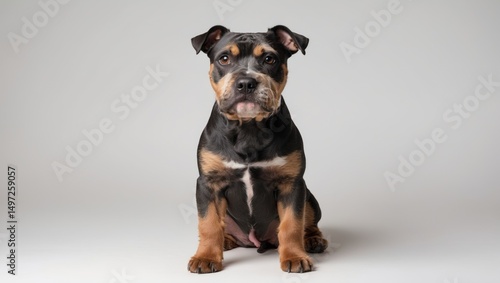 © Sona, Obraz premium A cute puppy with black and brown fur sitting on a plain white background.