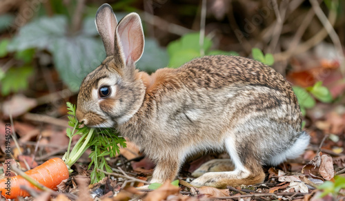 Fototapeta premium A cute rabbit munching on a carrot green in a natural garden setting.