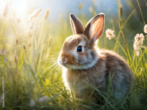 Fototapeta premium A cute rabbit sitting in a sunlit meadow surrounded by wildflowers during a...