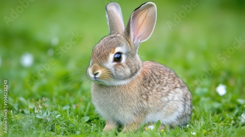 © danadesa, Fototapeta premium A cute rabbit sitting on lush green grass, showcasing its soft fur and alert expression.