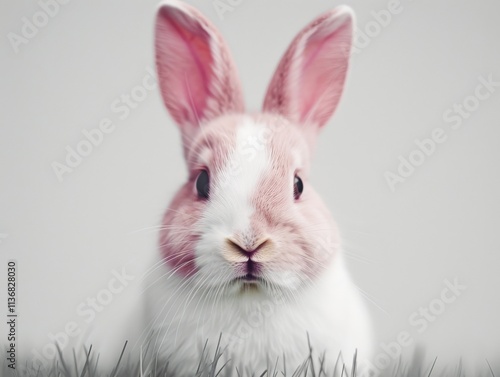 Fototapeta premium A cute rabbit with pink ears sits in soft grass, exuding charm and innocence against a neutral background.
