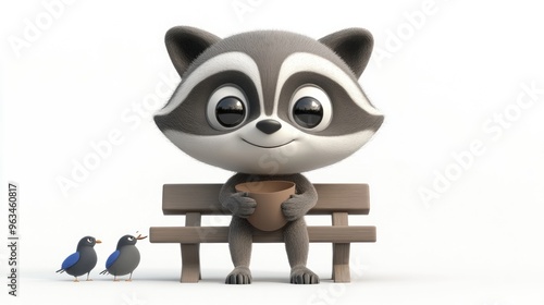 © BerkahStock, Obraz premium A cute raccoon sits on a bench holding a pot, accompanied by two small birds.
