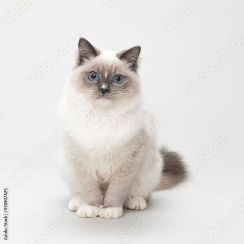 © izmargad, Fototapeta premium A cute ragdoll kitten looking straight at the camera. Studio shot. Solid off white background.