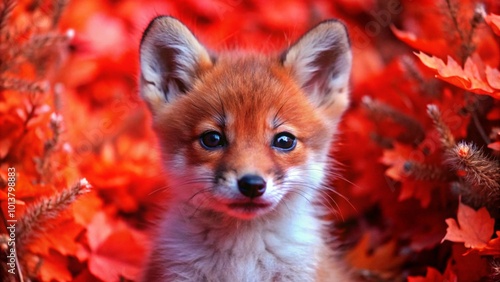 Fototapeta premium A cute red fox kit with blue eyes surrounded by red autumn leaves.