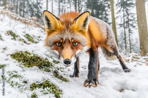 © Halina Berah, Fototapeta premium A cute red fox perches on an autumn field covered in wildflowers. This is a beautiful vulpes vulpes in its natural habitat. A captivating wildlife scene from nature, suitable for a wallpaper with a