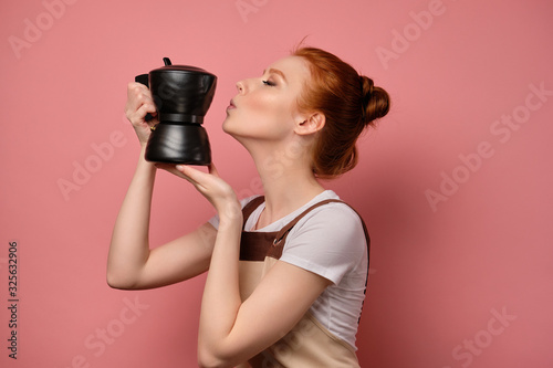 © bestsenny, Obraz premium A cute red-haired girl with a high bun in a apron stands in profile on a pink background and reaches for a kiss in a coffee pot