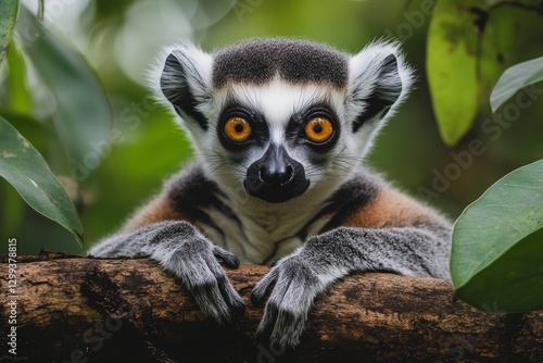 © Julia, Obraz premium A cute ring-tailed lemur relaxes on a tree branch, surrounded by verdant foliage