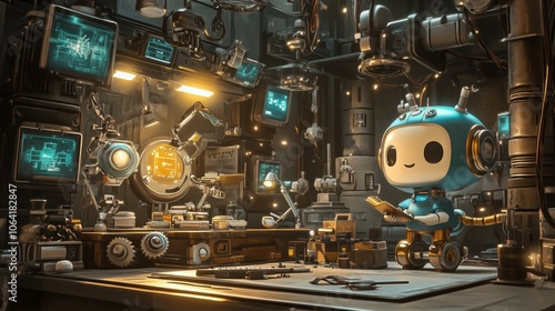 © Johari, Fototapeta premium A cute robot is working in an old laboratory