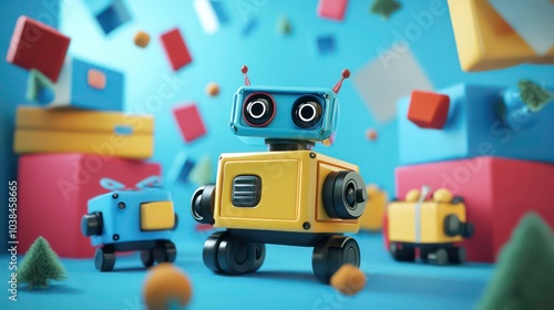 © ArmStrong☠, Obraz premium A cute robot toy stands in front of a colorful background with many presents.