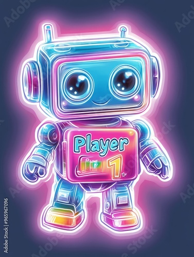 © Sirilak, Fototapeta premium A cute robot with a neon glow, wearing a player one badge.