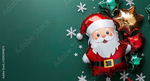© Kien, Fototapeta premium A cute Santa Claus foil balloon with a white beard and hat on a green background, surrounded by Christmas decorations
