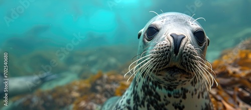 Fototapeta premium A cute seal off Southern California's Channel Islands surfaces and gazes at...
