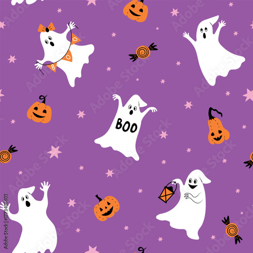 Fototapeta premium A cute seamless pattern with ghosts, pumpkins, and candy. Perfect for Halloween.