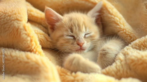 © paullawat, Fototapeta premium A cute sleeping baby cat in blanket