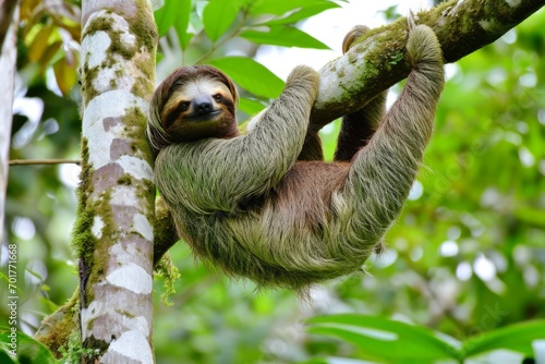 Fototapeta premium A cute sloth, hanging upside down on a curly branch, is seen chilling on a...