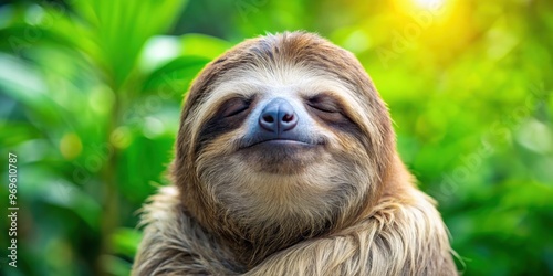 © somsak, Naklejka premium A cute sloth sitting in a meditative pose with closed eyes , Meditation, Relaxation, Animal, Zen, Calm, Peaceful