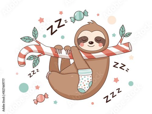 Naklejka premium A cute sloth sleeps soundly, hanging from a candy cane, wearing socks and...