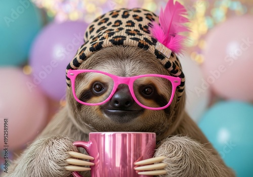 © Nyxoria, Fototapeta premium A cute sloth wearing a leopard print beanie and pink glasses holds a pink mug
