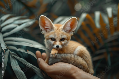 Fototapeta premium A cute small fox sitting on top of a person's hand. Perfect for animal lovers...