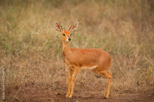 Obraz premium A cute steenbok, a small antelope with very pretty ears, looks around carefully and alertly for possible danger in its grassland habitat in the Kruger National Park in South Africa.