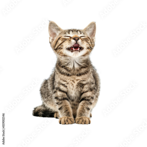 Obraz premium A cute, striped tabby kitten with its eyes closed and mouth open isolated on...