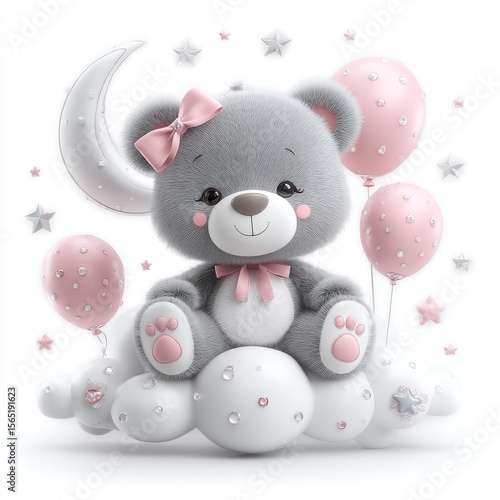 © Bundi, Obraz premium A cute teddy bear is depicted in a watercolor illustration sitting on a cloud surrounded by balloons
