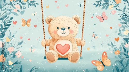 Fototapeta premium A cute teddy bear with a heart sits on a swing, surrounded by butterflies and...