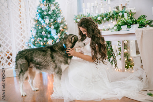 Obraz premium A cute teenage girl with long dark curly hair in a white airy ball gown near the Christmas tree in a room with a classic Christmas decor with a large Malamute. Christmas mood. pets