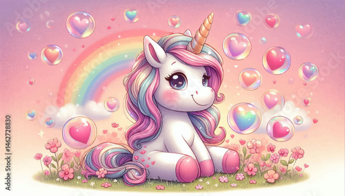 © Dzianis, Naklejka premium A cute unicorn sitting on a lawn with pink flowers, around which soap bubbles with hearts are flying on a pink background with a rainbow. A greeting card. Vector graphics. EPS.