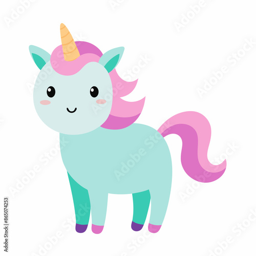 © Valeriia, Naklejka premium A cute unicorn with a pink mane and tail stands on a white background