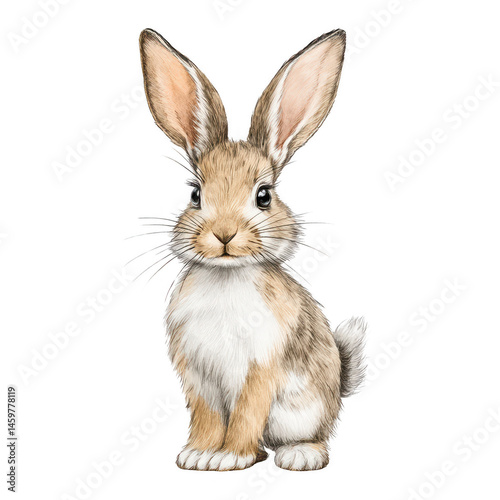 © niramol, Obraz premium A cute watercolor bunny with long ears is sitting on a white background.
