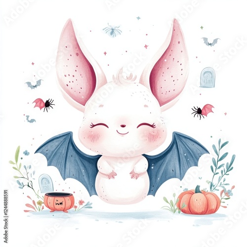 © Momphoto, Obraz premium A cute, whimsical creature with bat wings and large ears, surrounded by pumpkins, spiders, and a spooky atmosphere, perfect for Halloween.