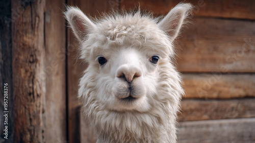 © Jhati, Fototapeta premium A cute white alpaca looks directly at the camera.
