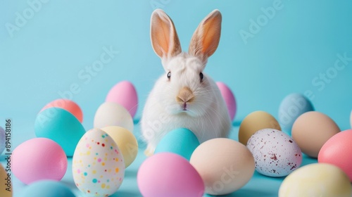 Obraz premium A cute white bunny surrounded by colorful Easter eggs on a light blue background, symbolizing Easter celebration.