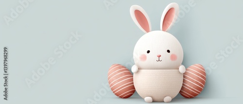 © DSimage, Obraz premium A cute white bunny with pink ears sits beside a colorful striped egg.