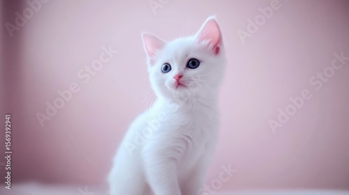 © patsadaporn, Fototapeta premium A cute white kitten with striking blue eyes poses against a soft pink background, perfect for conveying warmth and playfulness in pet-related marketing, greeting cards, or social media content,