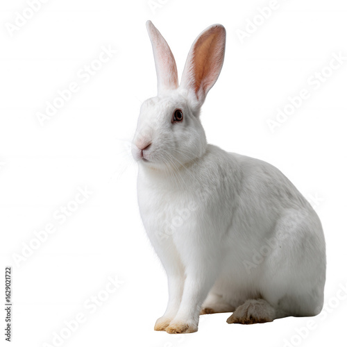 Fototapeta premium A cute white rabbit sitting gracefully with alert ears and bright eyes, isolated against a clean white background.
