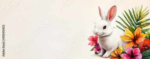 © Jakrapan, Obraz premium A cute white rabbit surrounded by vibrant tropical flowers against a soft, neutral background.