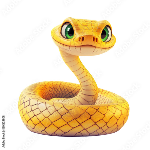 Fototapeta premium A cute yellow cartoon snake with large green eyes is playfully coiled on a white background.